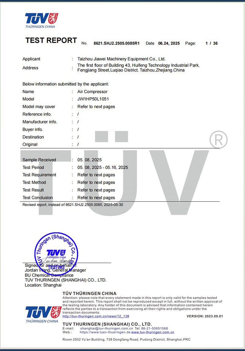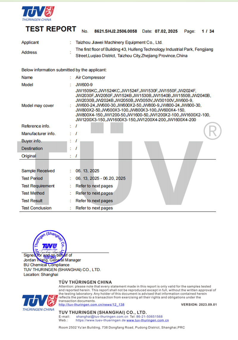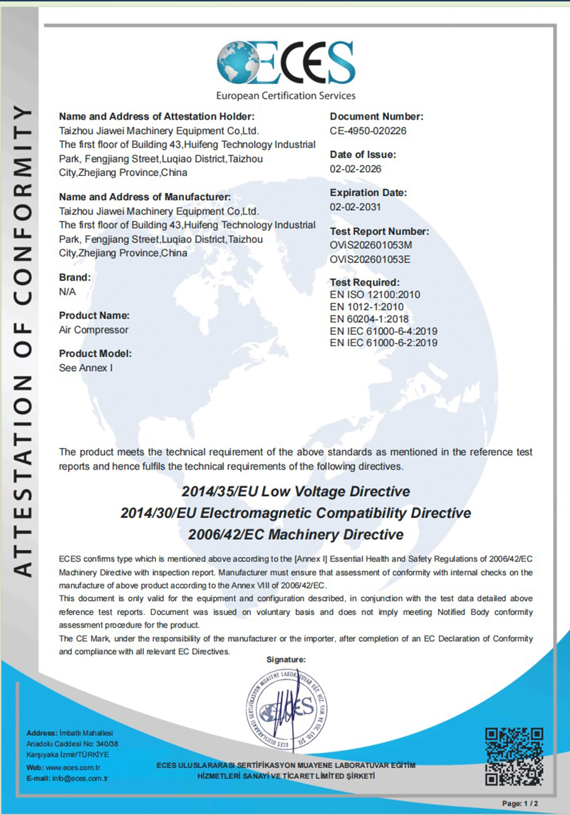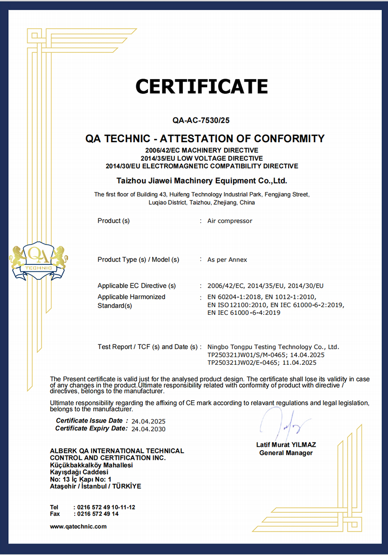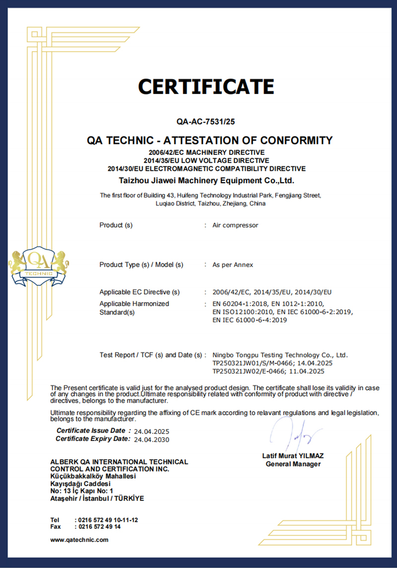 公司已通过ISO9001质量管理体系认证,所有产品均获得CE、RoHS认证,并配备完整的安全测试报告、风险评估报告及电磁兼容(EMC)报告。我们秉承“质量优先、创新驱动”的理念,持续提供高品质空压机产品,赢得了全球客户的高度认可与信赖。