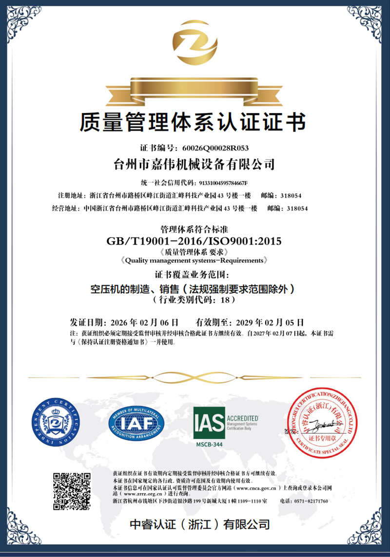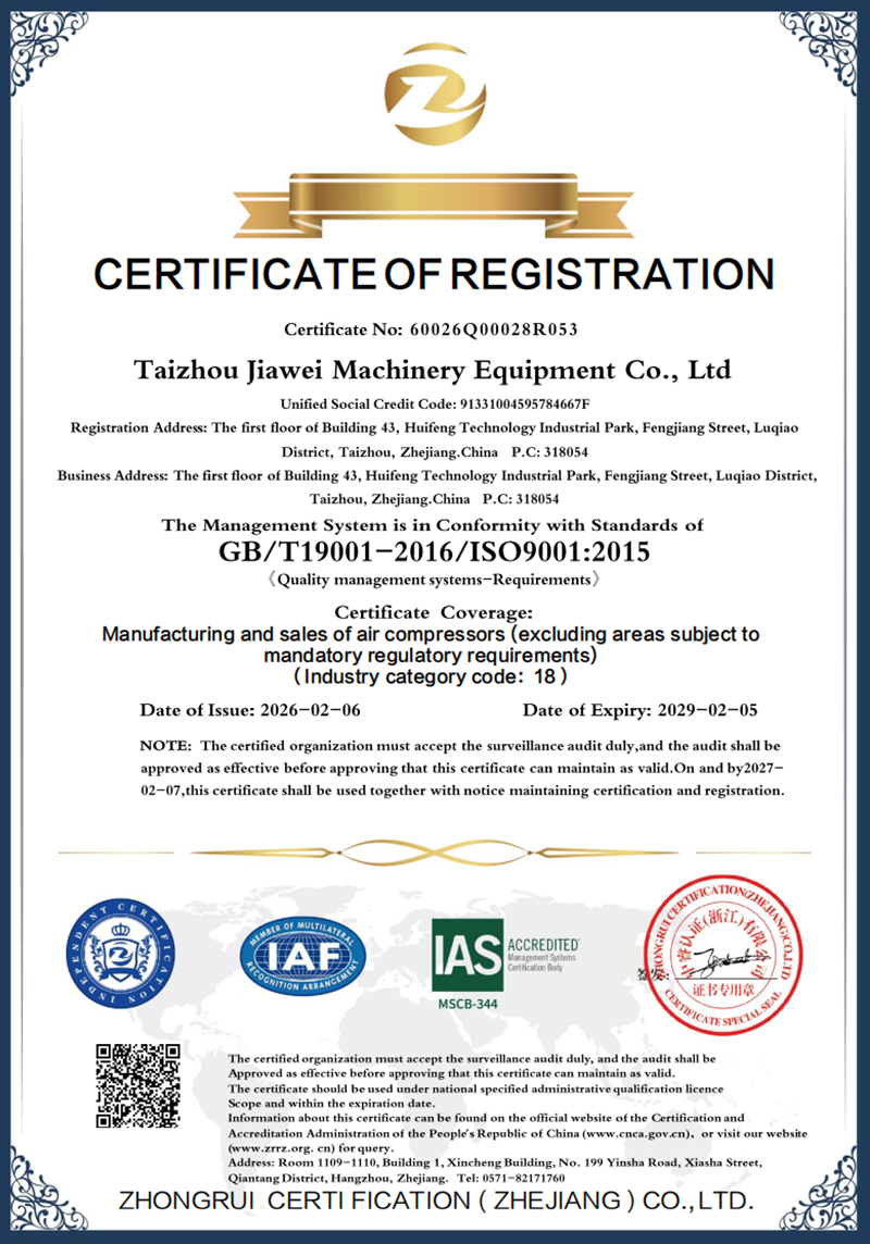 Taizhou Jiawei Machinery Equipment Co., Ltd. is a professional manufacturer specializing in air compressors, integrating R&D, design, production, sales and after-sales service. With an efficient management system, advanced production equipment and an experienced technical team, the company provides customers with customized solutions to meet diverse needs.